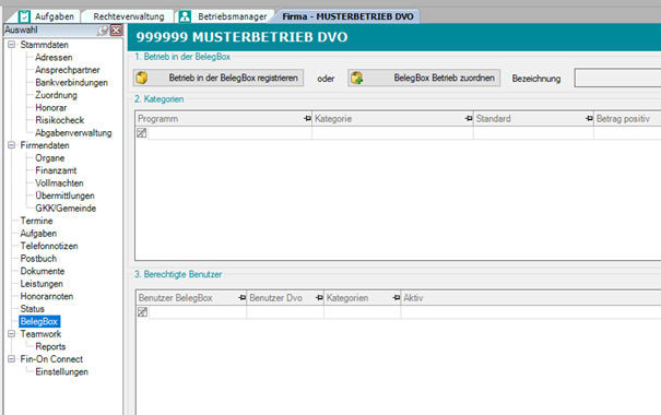 Wählen Sie dazu den gewünschten Betrieb im Betriebsmanager von dvo Studio/WT.Organizer und öffnen Sie ihn mit Doppelklick. Gehen Sie unter "Auswahl" zur Lasche "BelegBox", und klicken Sie anschließend auf "Betrieb in der BelegBox registrieren".