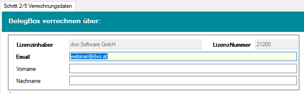 Die Verrechnung der monatlichen Gebühren erfolgt über den Lizenzinhaber der dvo Studio/WT.Organizer-Installation, aus der die Registrierung erfolgt. Die im dvo Studio/WT.Organizer hinterlegten jeweiligen Stammdaten werden entsprechend vorgeschlagen.