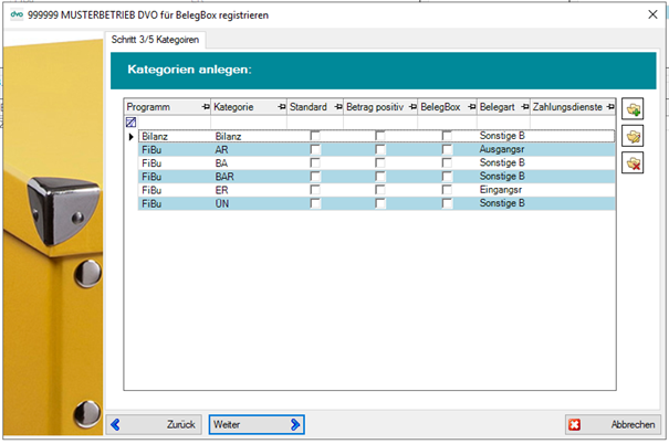 Markieren Sie in der Spalte „BelegBox“ jene Belegkreise/Kategorien, die Sie für die Nutzung durch die BelegBox freischalten wollen.