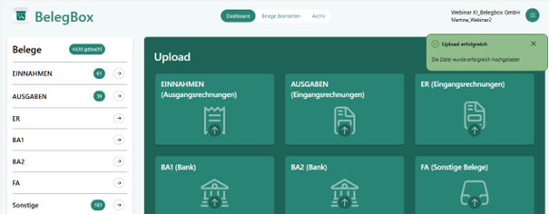Im Belege-Widget links wird die Anzahl der noch nicht verbuchten Belege entsprechend erhöht.