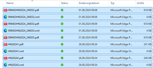 Die Zusammengehörigkeit der beiden Dateien wird am Dateinamen erkannt. Diese muss (ausgenommen der Dateiendung) ident sein. Pro Beleg müssen eine XML-Datei und eine pdf-Datei vom Aussteller bereitgestellt werden.