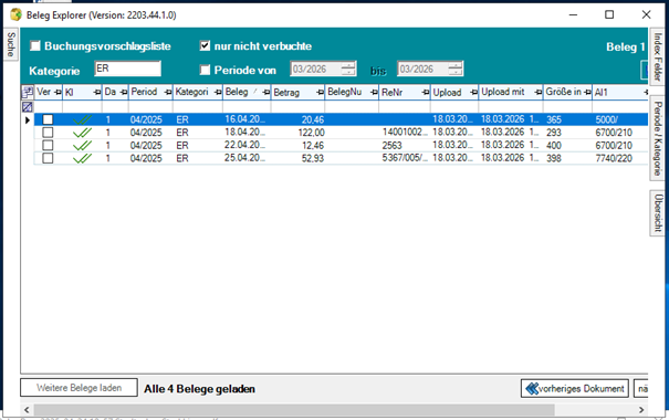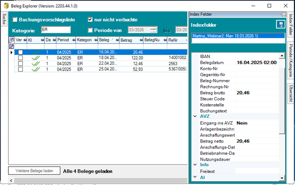 Wenn bei allen Belegen das Datum angepasst wurde, klicken Sie einmal auf „Aktualisieren“, damit werden die Indexdaten aller Belege neu geladen und die Belege entsprechend sortiert.