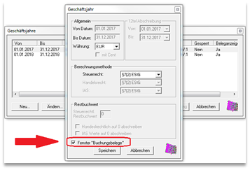 Unter „Betrieb“ „Wechsel Geschäftsjahre“ „Ändern“ setzen Sie beim betreffenden Geschäftsjahr die Markierung „Fenster Buchungsbelege“.