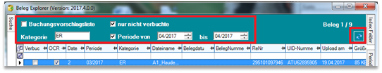 Wie in den anderen Programmen gewohnt können Sie über den Belegexplorer auf jeden benötigten Beleg zugreifen. Stellen Sie im oberen Bereich ein, unter welcher Zuordnung (Kategorie, Zeitraum, gebucht/nicht gebucht) der Beleg hochgeladen wurde.