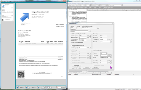 Öffnen Sie den gewünschten Beleg aus der Liste, sodass dieser im Belegfenster angezeigt wird. Wird ein Anlagegut gespeichert, während der zugehörige Beleg im Belegfenster geöffnet ist, wird der Beleg automatisch zum Anlagegut gespeichert.