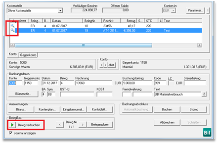 - Nachdem die Eingabe der Bilanzbuchung mit „Buchen“ fertiggestellt wurde, ist die betreffende Buchung automatisch mit dem Beleg verknüpft. Selbstverständlich bleiben bei allen anderen Buchungen, die zu dem Beleg schon erfasst wurden, die Belegverknüpfungen unverändert erhalten.