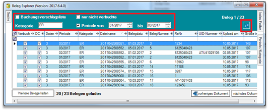 Mit der Aktualisieren-Schaltfläche werden alle Ihrer Einstellung entsprechenden Belege in den Belegexplorer geladen.