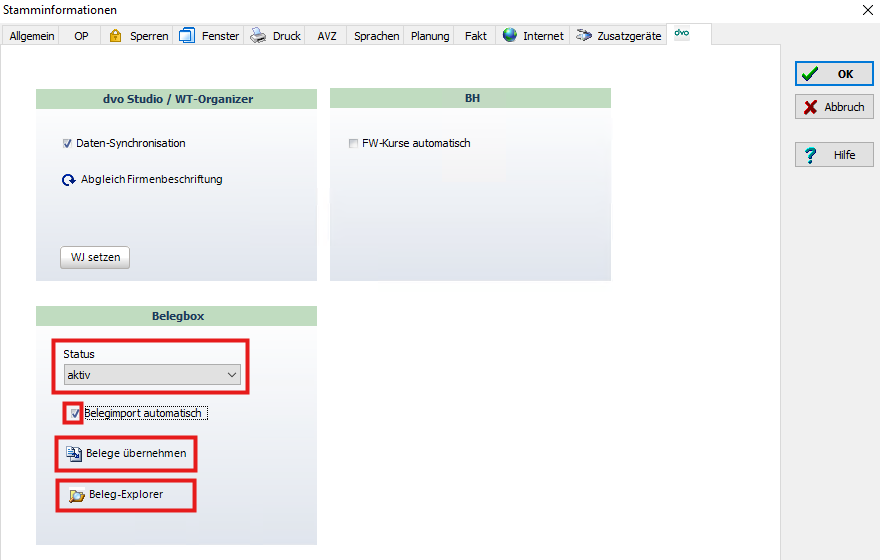 Sie können unter Menü Datei/Stamminfo/Einstellungen in der Lasche dvo erkennen, ob die Belegbox für Ihre Buchhaltung bereits eingerichtet ist.