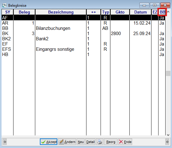Sie können unter Menü Buchen/Belegkreise jedoch jederzeit überprüfen, welche Belegkreise für die Belegbox aktiviert sind – dafür gibt es in der Liste die Spalte BB (Belegbox) die in diesen Fällen mit Ja befüllt ist: