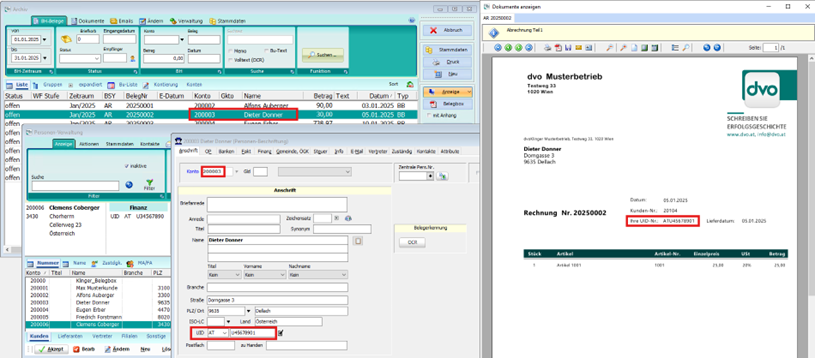 Bei der Abholung werden auch die ausgelesenen Stammdaten des Beleges (UID-Nummer, IBAN des Geschäftspartners) überprüft und mit dem Personenstamm der FiBu abgeglichen. Bei Übereinstimmung von UID bzw. IBAN wird das entsprechende Personenkonto direkt in der Archiv-Liste vorausgefüllt und dargestellt: