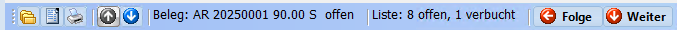 Die Informationen des aktiven Belegs der Archivliste werden in der Archiv-Toolbar angezeigt (z. B.: AR xx Betrag offen). Hier wird auch angezeigt wie viele Belege in der Liste offen sind bzw. verbucht wurden. Zum aktiven Beleg können Buchungen erfasst werden.
